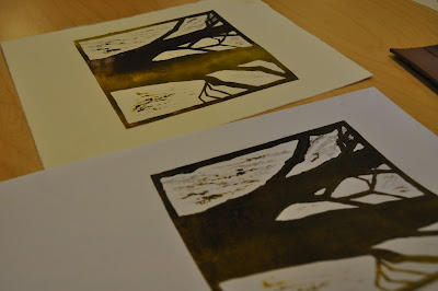 Vi har i de siste ukene drevet med høytrykk. Vi har valgt ulike temaer, tegnet skisser, skjært ut av linoliumplater og trykt med ulike farger på et spesielt papir. Hittil har vi hatt "pløyd mark" og "nakne trær" som tema, og det har gått veldig fint. Spennende å blande farger og prøve seg frem i trykkingen. Vi avslutter med å skjære ut pasepartoutrammer for å gi bildene våre en bedre "look". Det blir bra å få de opp på veggen hjemme, for mange av de blir utrolig stilige!!